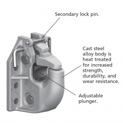 The SAF Holland PH-550 is a rigid mount pintle hook for trailers and semitrailers in doubles and triples operations. Use this pintle hook for off-road and over-the-road applications. The included air cushioned snubber is designed to minimize the gap between the pintle hook and the drawbar eye on vehicles with air systems.